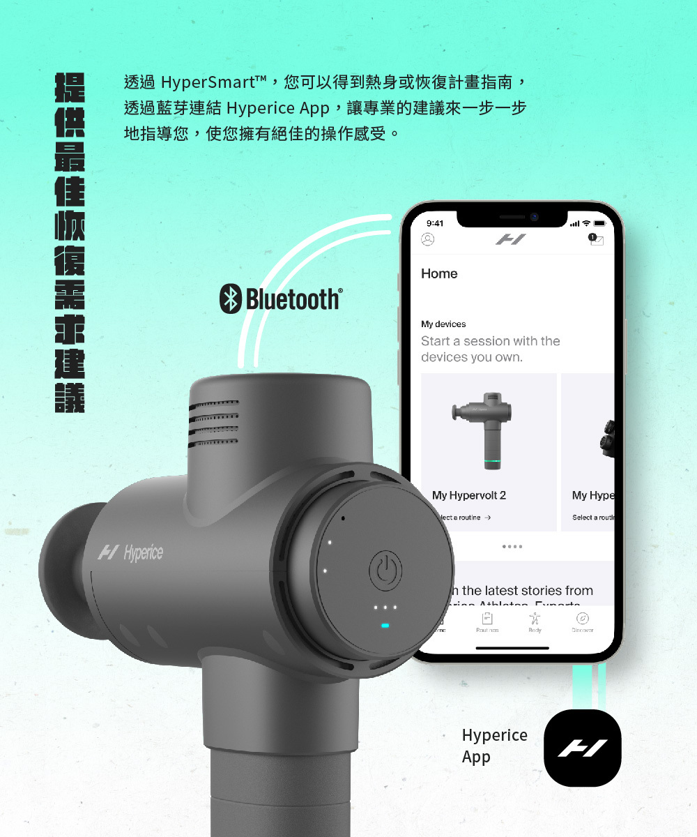 透過HyperSmart™,您可以容易地得到熱身或恢復計畫指南,透過藍芽連結Hyperice App,讓專業的建議來一步一步地指導您,使您擁有絕佳的操作感受。