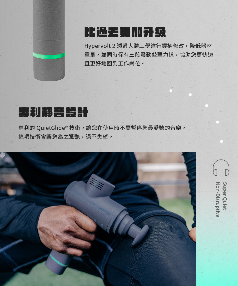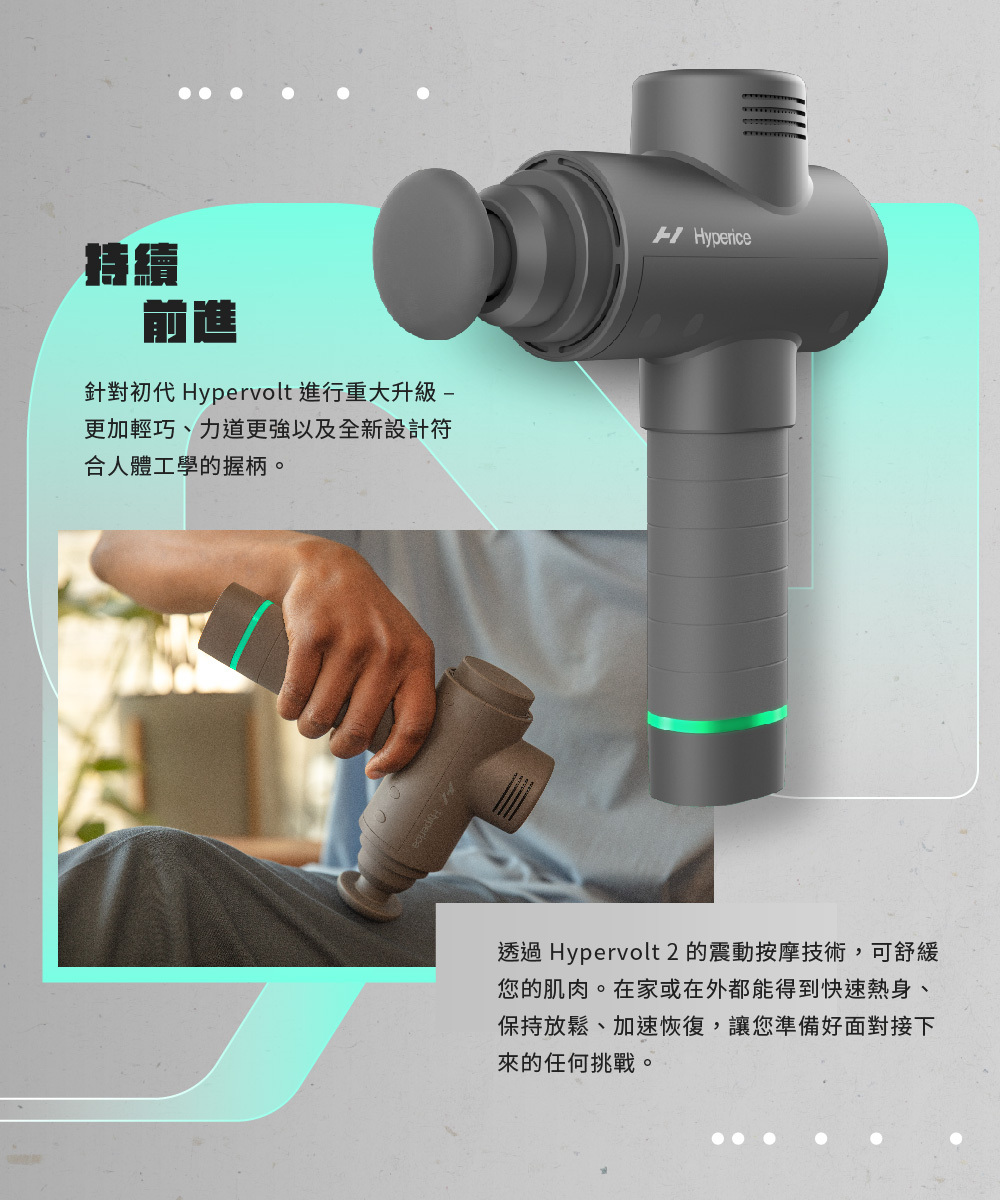 針對初代Hypervolt進行重大升級 – 更加輕巧、力道更強以及全新設計符合人體工學的握柄。