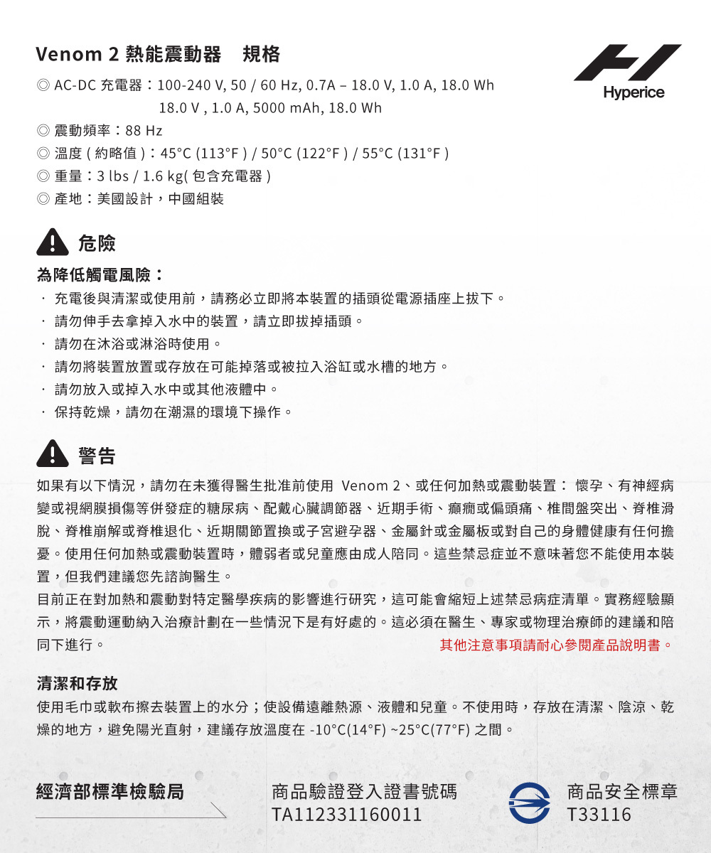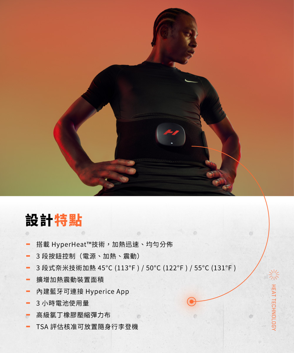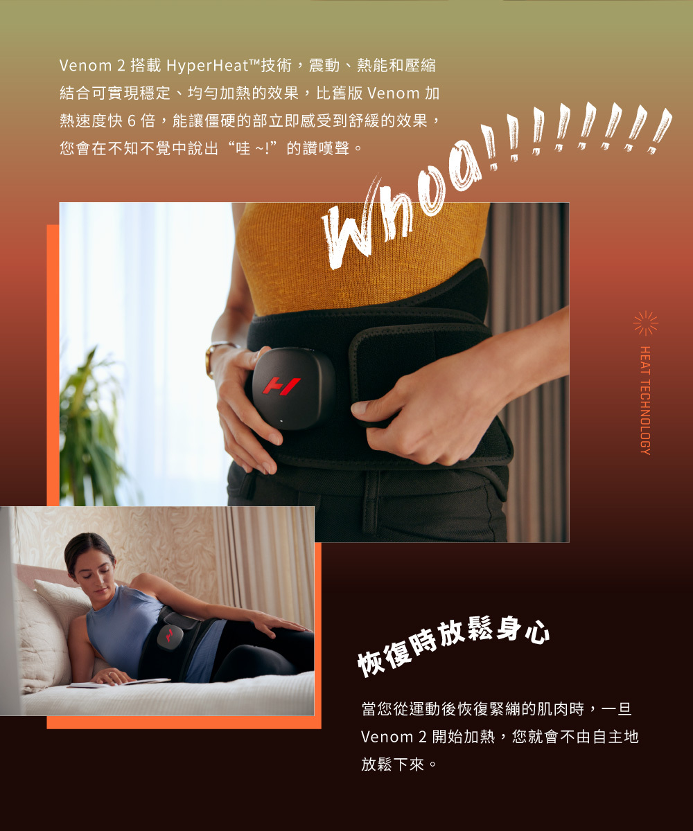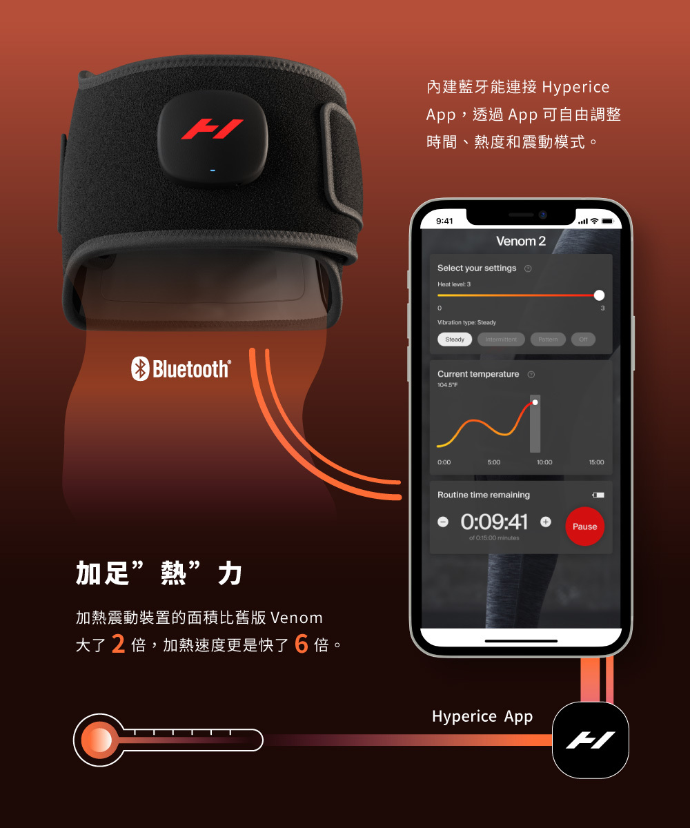 Venom 2系列擁有全新的氯丁橡膠彈力布,可輕鬆調整鬆緊且輕便舒適。長達3小時的電池使用量,以及內建藍牙可與Hyperice App連接以進行遠端操控,讓您可以在任何地方放鬆地享受溫暖體驗。
