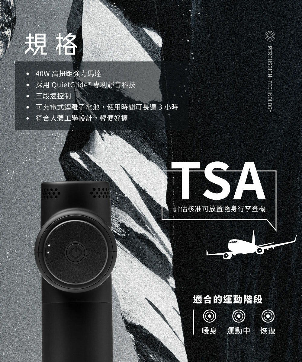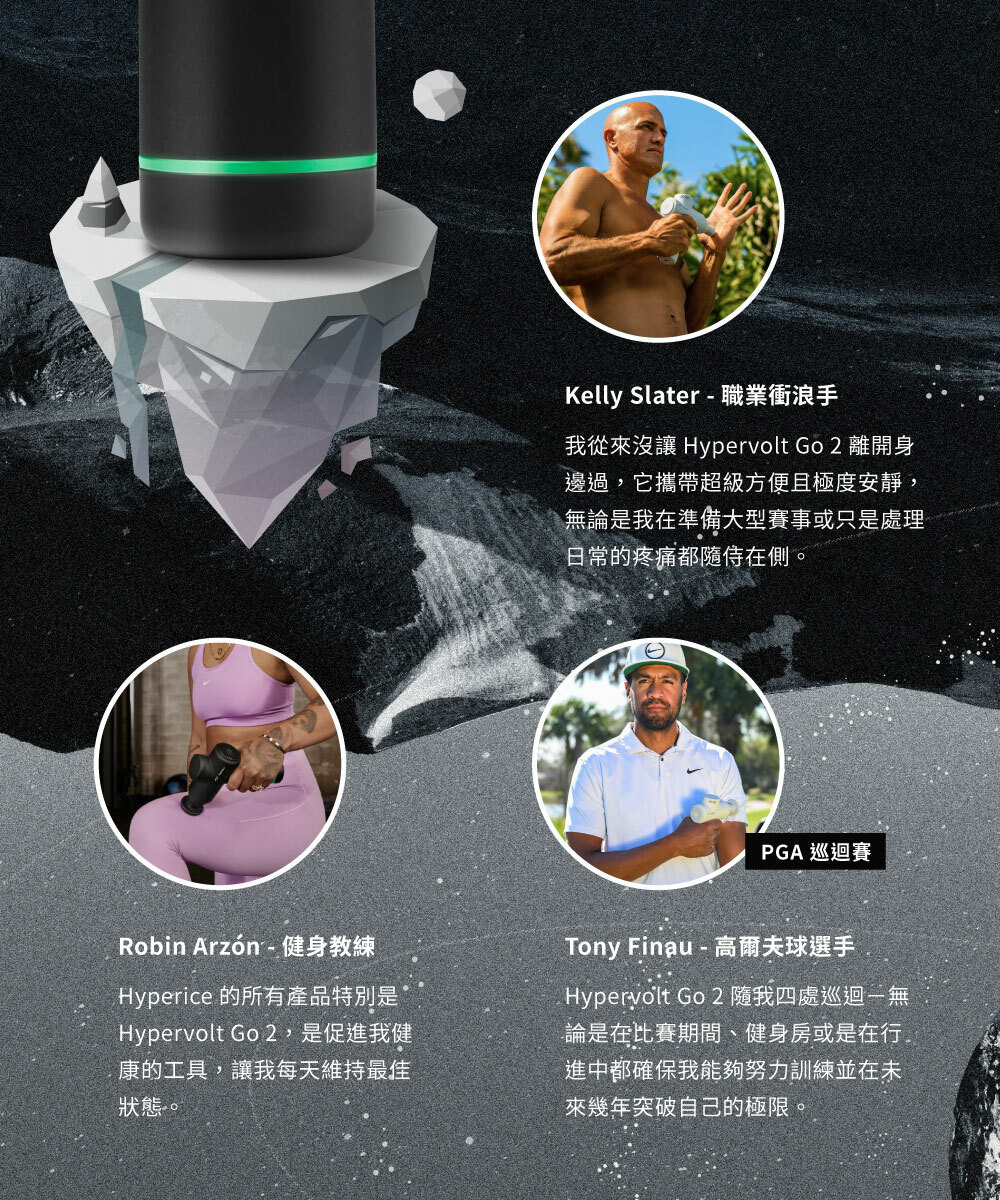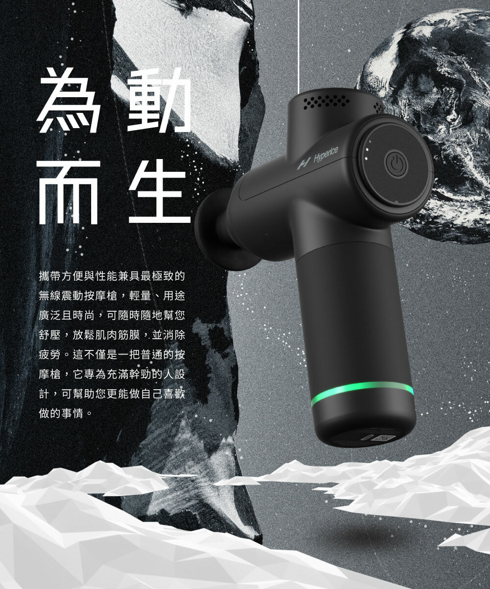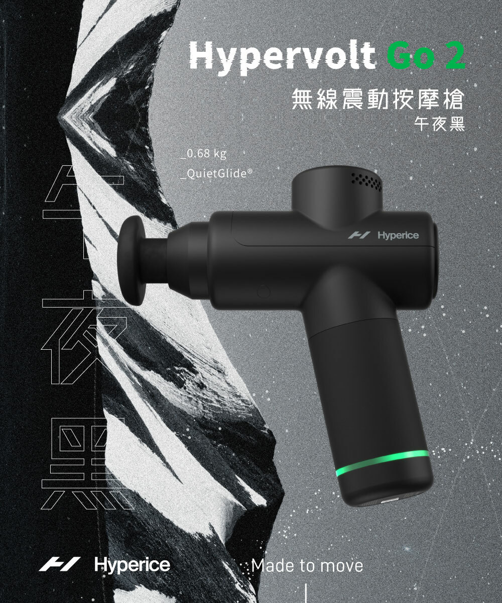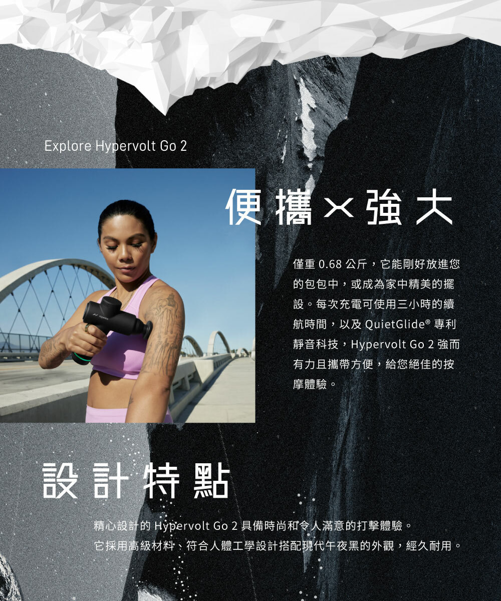 僅重0.68公斤,它能剛好放進您的包包中,或成為家中精美的擺設。每次充電可使用三小時的續航時間,以及QuietGlide®專利靜音科技,Hypervolt Go 2強而有力且攜帶方便,給您絕佳的按摩體驗。